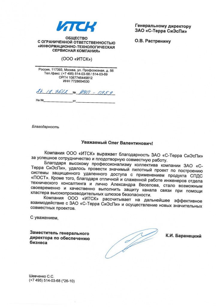Благодарственное письмо от компании ООО «Информационно-технологическая сервисная компания»