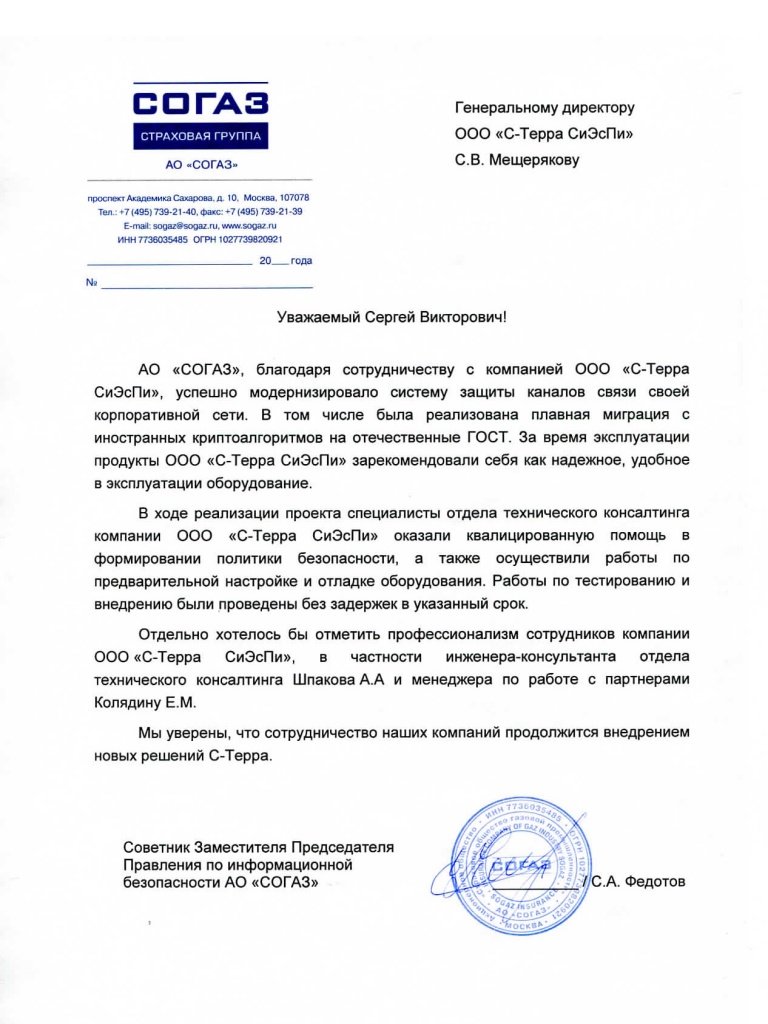 Благодарственное письмо от страховой группы «СОГАЗ»