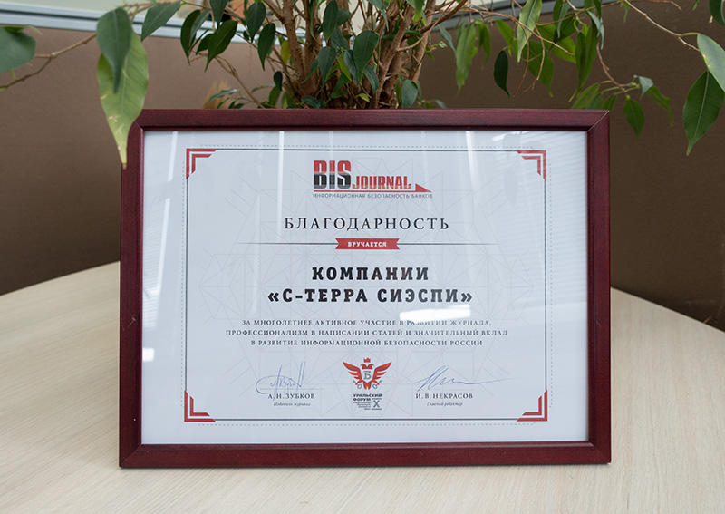 Во время проведения Уральского форума, который проходил 12–16 февраля 2018 года в Башкортостане, представителям компании «С-Терра СиЭсПи» в торжественной обстановке была вручена памятная благодарность от редакции BIS Journal за многолетнее активное участие в развитии журнала, профессионализм в написании статей и значительный вклад в развитие информационной безопасности России.