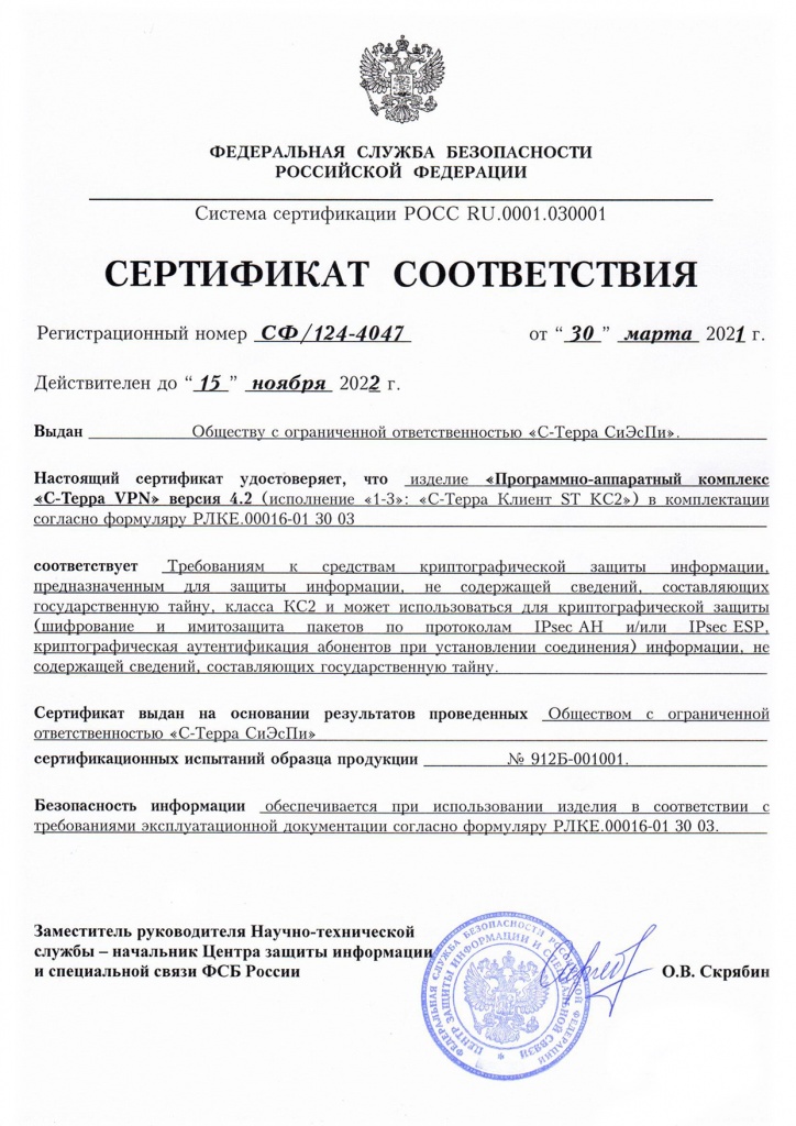Срок действия сертификатов ФСБ России продлён до 15 ноября 2022 г. для С-Терра Клиент версии 4.2 по классам КС1 и КС2: