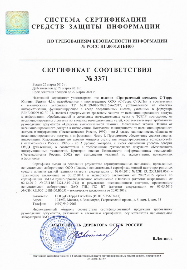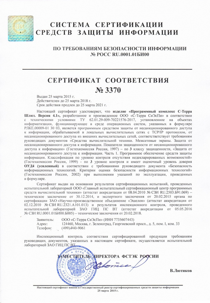 Срок действия сертификатов ФСТЭК России на продукты «С-Терра Шлюз» и «С-Терра Клиент» версии 4.1 продлен до марта 2021 г.