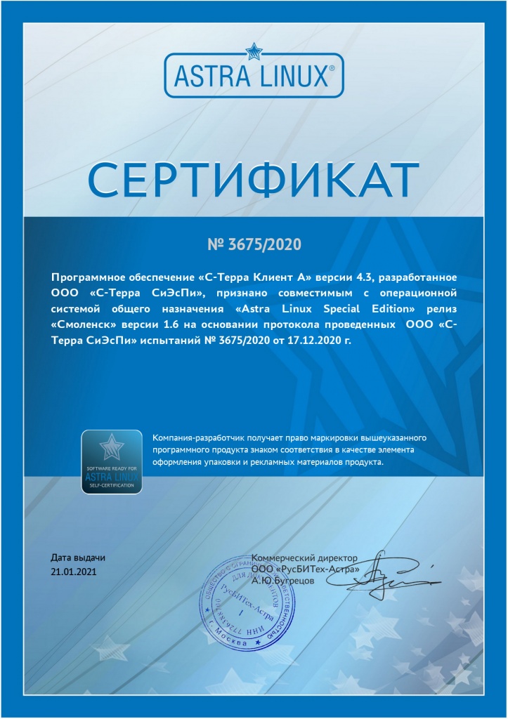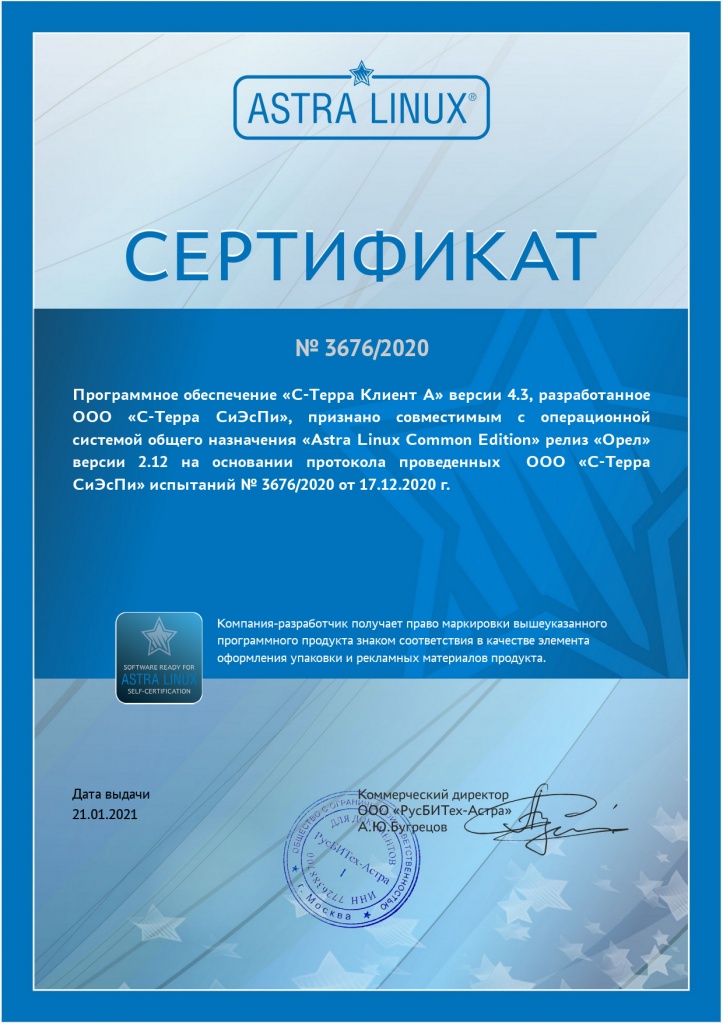 В ходе испытания установлено, что «С-Терра Клиент А», корректно устанавливается и функционирует в указанных ОС, удаление из состава ОС осуществляется успешно. Результаты проведенного исследования на совместимость показали пригодность к применению VPN-клиента с обеими операционными системами Astra Linux и официально подтверждены сертификатами Ready for Astra Linux 3675/2020 и 3676/2020.