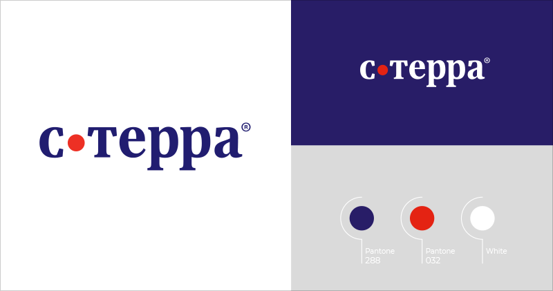 Мы сохраняем цветовую карту бренда «С‑Терра». Синие буквы, красный круг (мы привыкли считать, что это точка) и белый фон — это основное цветовое решение. Для использования логотипа на тёмном фоне применяется белый цвет букв, красный элемент при этом остаётся неизменённым.