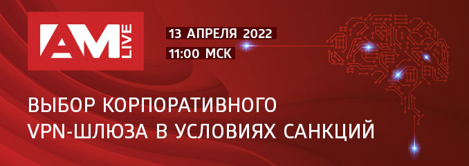13 апреля 2022 г. пройдет прямой эфир AM Live, посвященный теме «Выбор корпоративного VPN‑шлюза в условиях санкций». В обсуждении самых актуальных вопросов примет участие эксперт компании «С-Терра СиЭсПи» Андрей Шпаков.