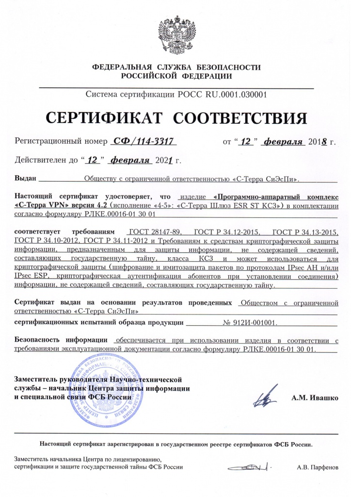 Согласно сертификату от 12.02.2018 «Программно-аппаратный комплекс «С-Терра VPN» версия 4.2 (исполнение 4-5: «С-Терра Шлюз ESR ST КС3») соответствует требованиям к средствам криптографической защиты информации, не содержащей сведений, составляющих государственную тайну, по классу КС3.