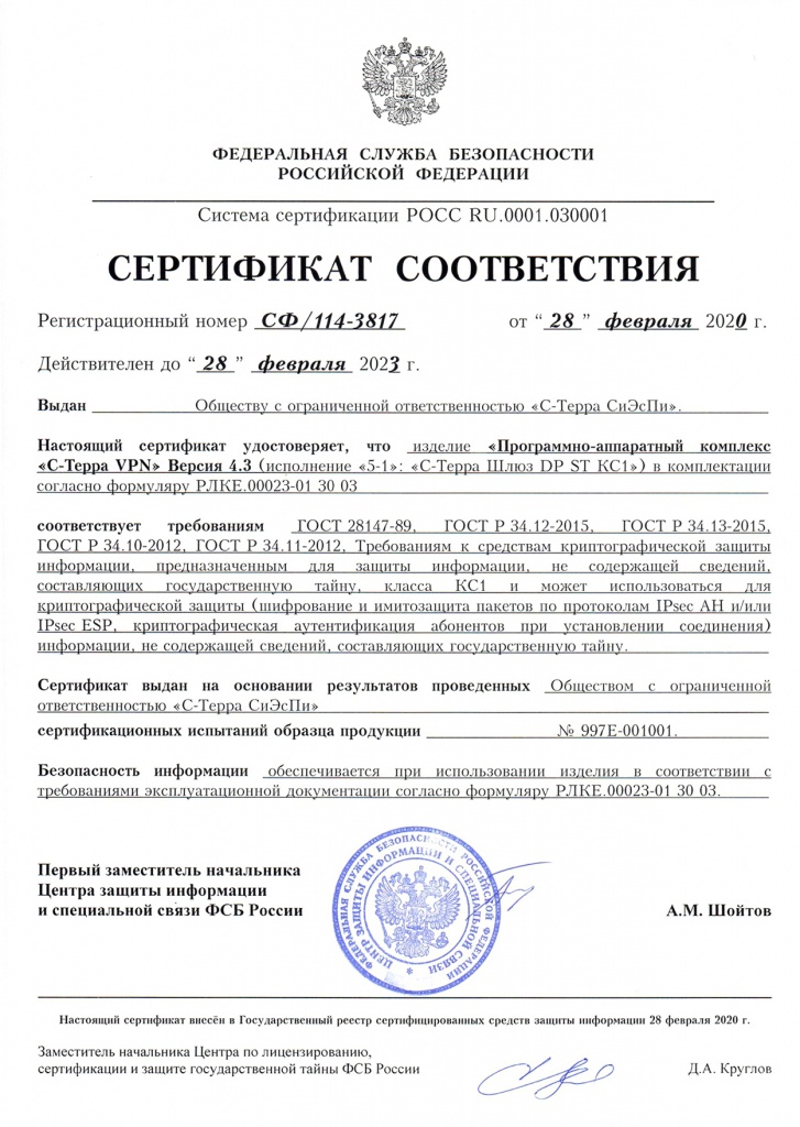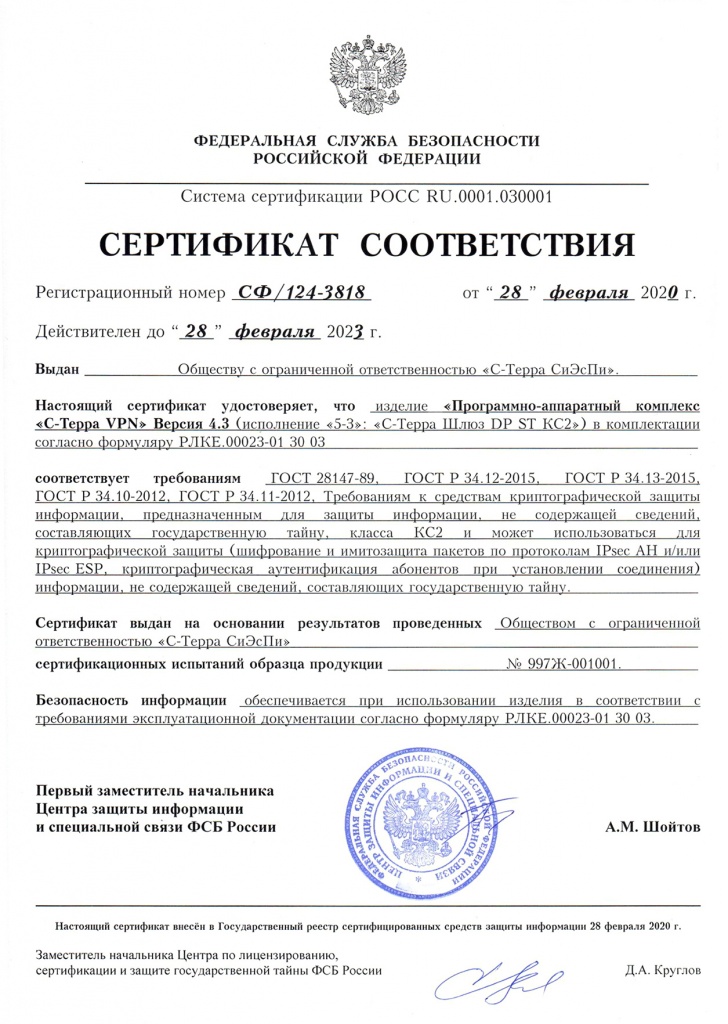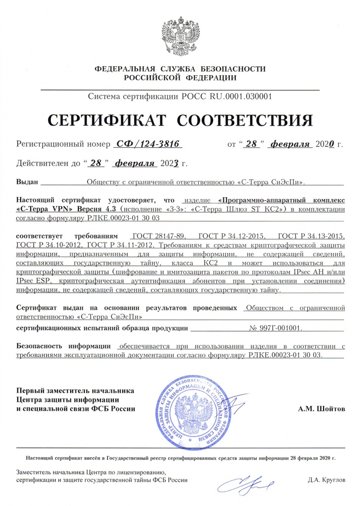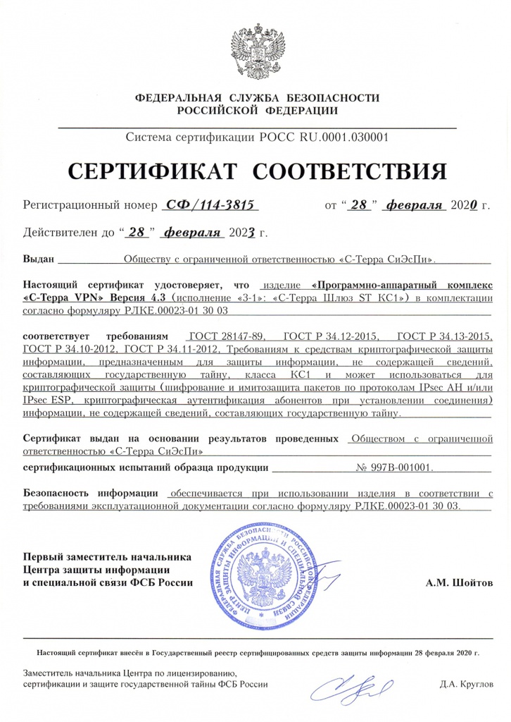Сертификаты ФСБ России на шлюзы безопасности С-Терра версии 4.3