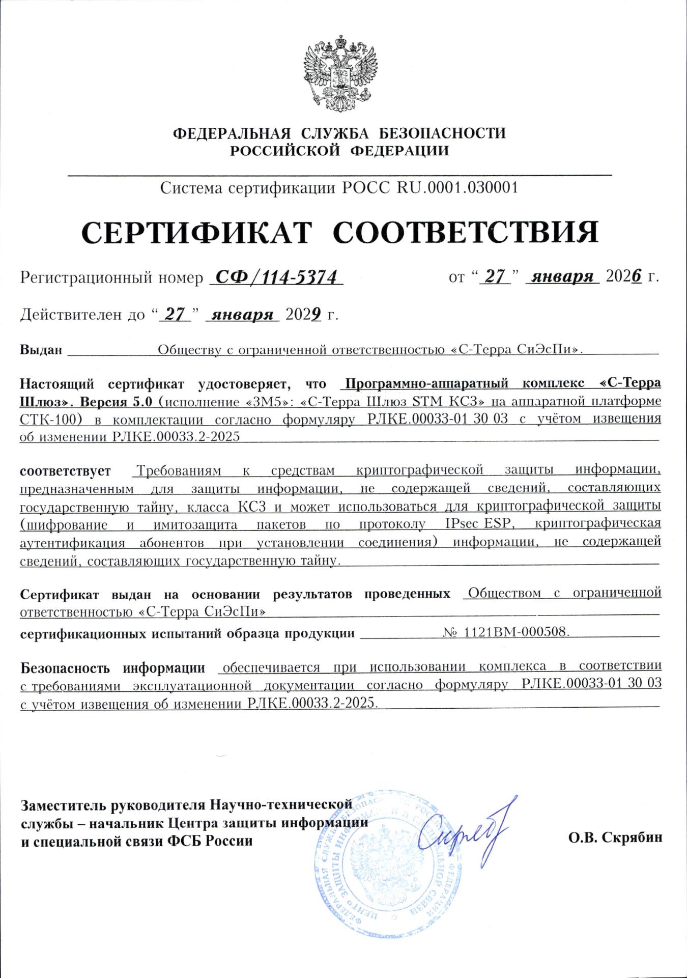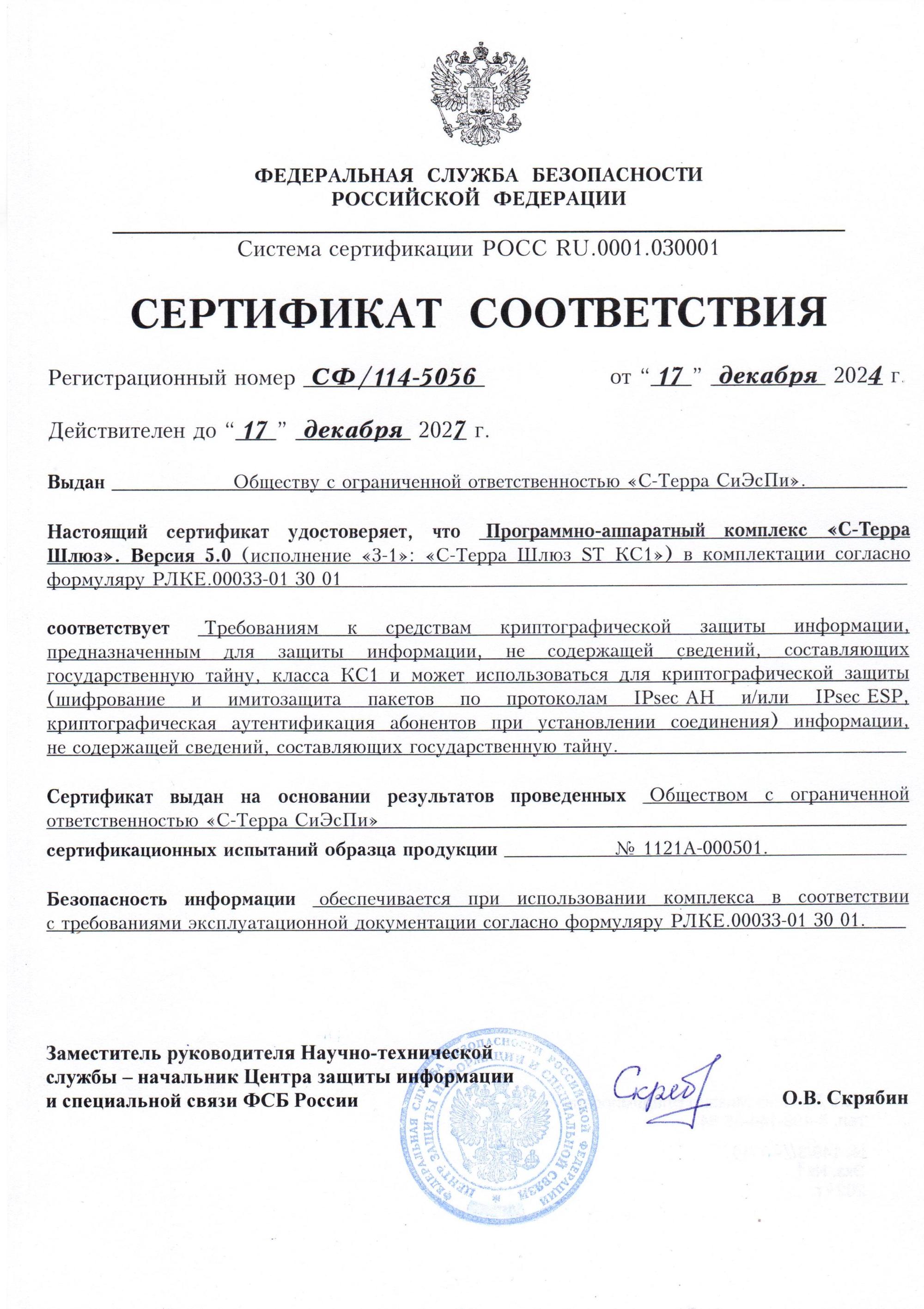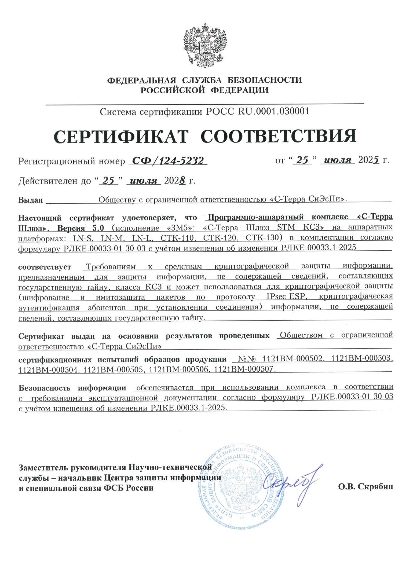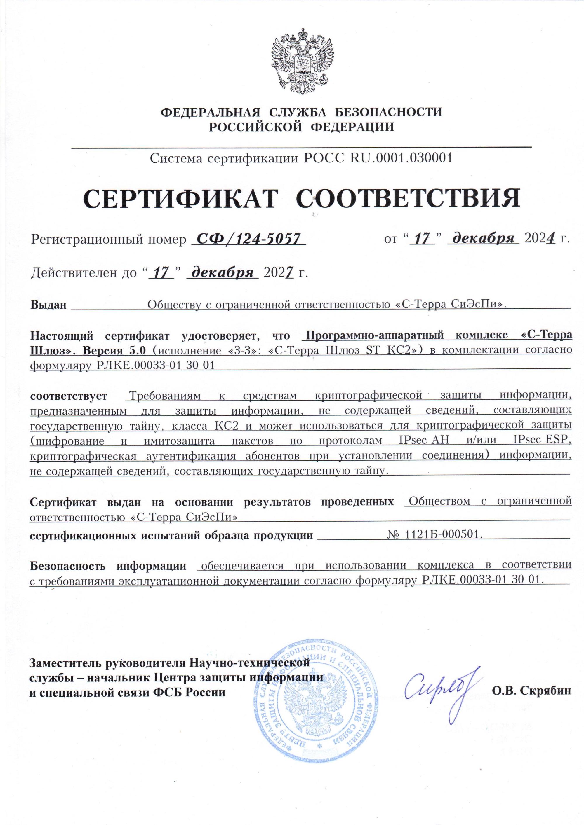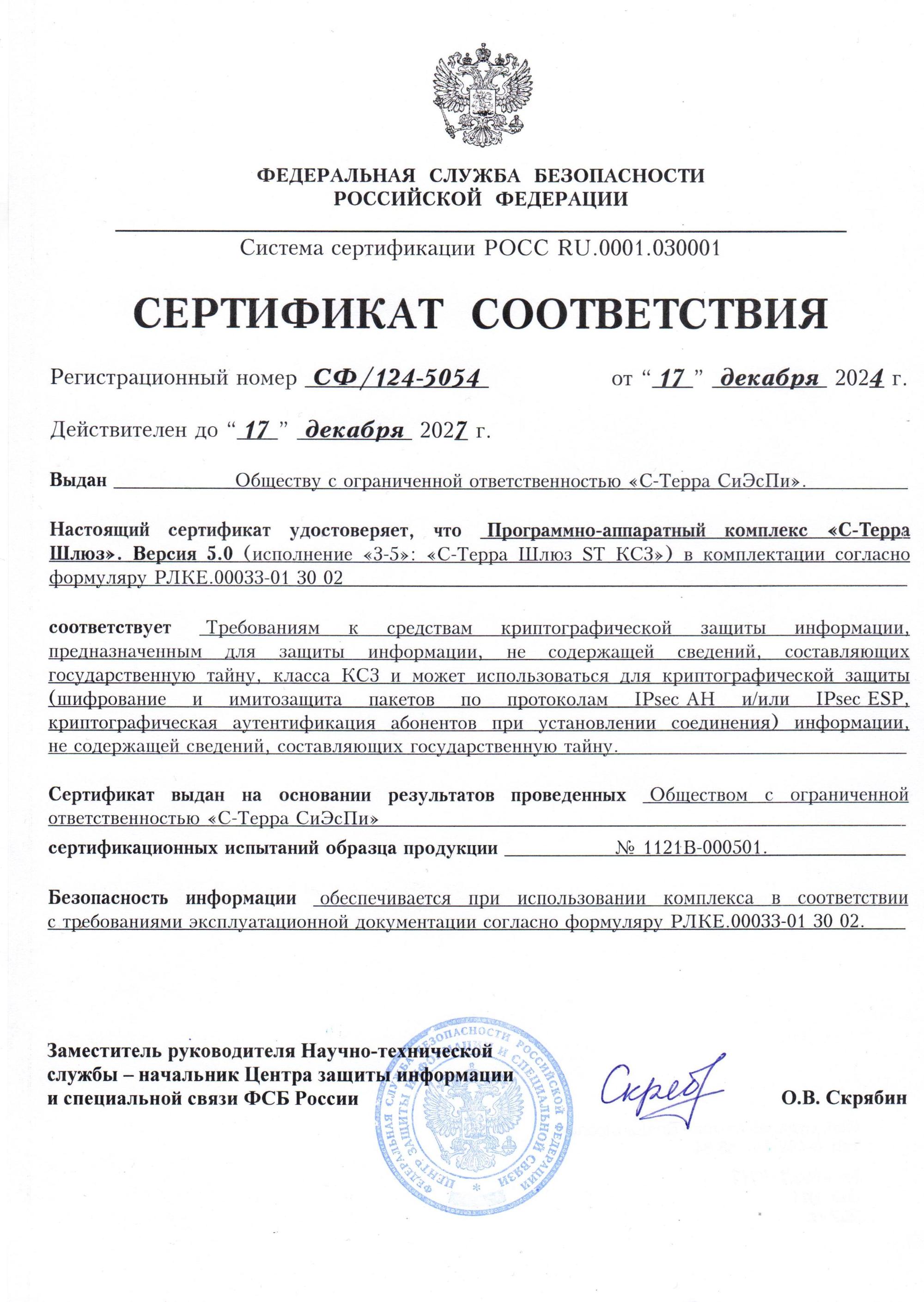 Программно-аппаратный комплекс (программный комплекс на аппаратной платформе) для обеспечения безопасности сети связи любой топологии (VPN), с любым количеством туннелей. Обеспечивает криптографическую защиту и фильтрацию как трафика подсетей, проходящего через него, так и защиту трафика самого шлюза безопасности.